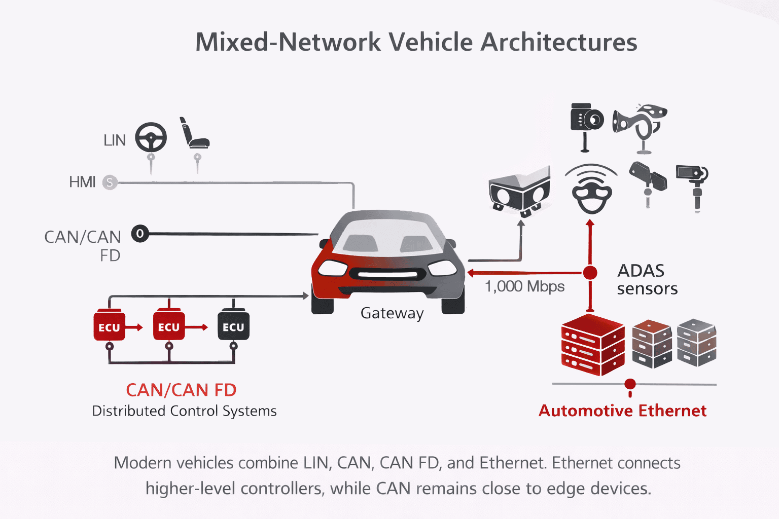Instead of dozens of isolated networks, Ethernet often connects higher-level controllers, while CAN remains close to edge devices such as sensors and actuators.